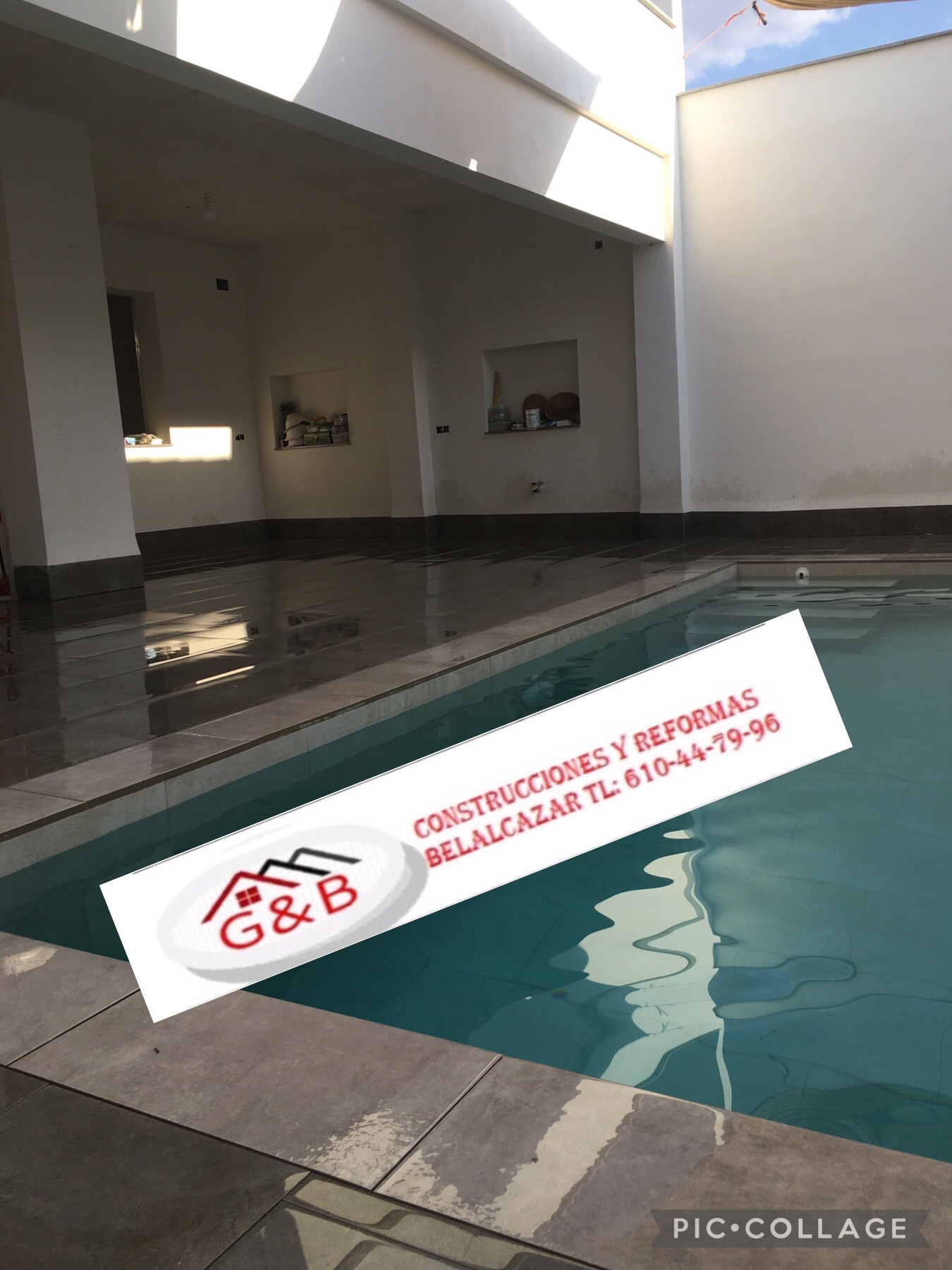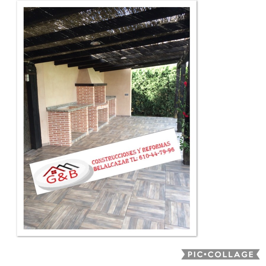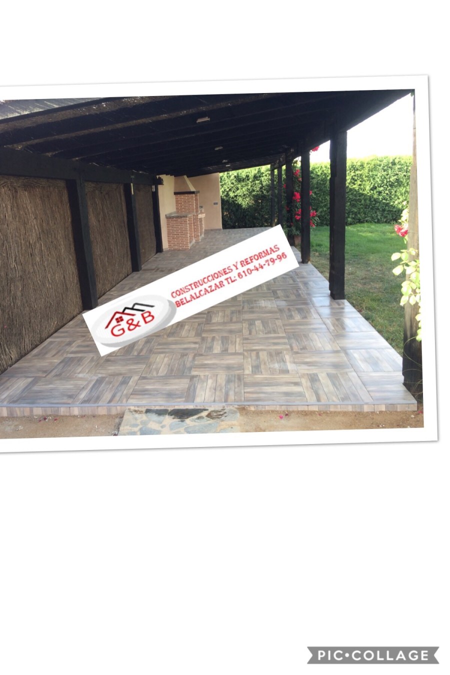Porche con palos de madera curados y vigas envejecías con tratamiento para exteriores, barbacoa y encimerá realizada con ladrillo rústico con soleria auto deslizante porcelanico.